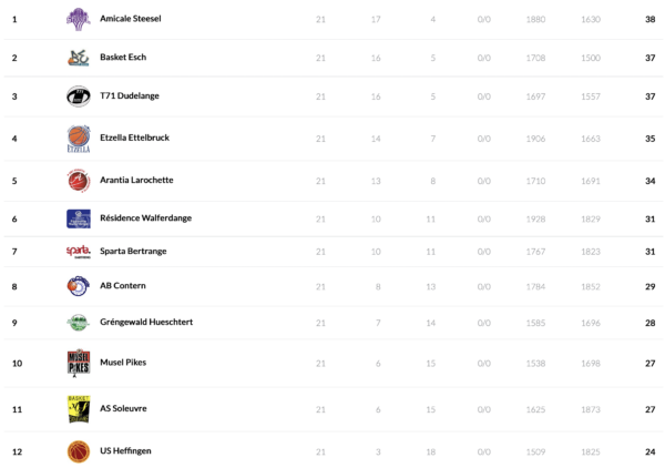 Sparta and Contern fight for the 3rd place in a direct showdown on the last game day. In fact, Contern would have to beat Sparta by more than 11 points to pass the team in the standings. If Sparta wins the game or loses by less than 11 points, the team from Bertrange takes 3rd place. Résidence will stay on the 4rd place if Contern loses against Sparta. If Contern beats Sparta, Résidence falls to the 5th spot.