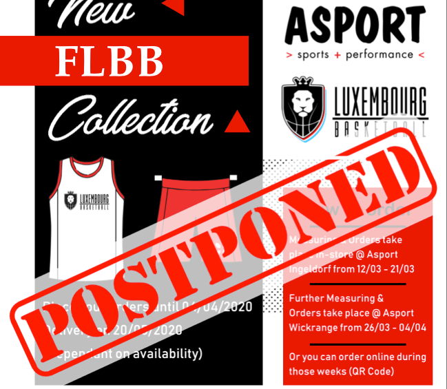 The Basketball Federation communicates that it postpones its FLBB collection (where the deadline for the orders was set for April 4th) due to the current situation and the measures around COVID-19 virus. Together with ASPORT, we will continue to monitor the situation and communicate a new timeline (for trying on and making the orders) as soon as possible.