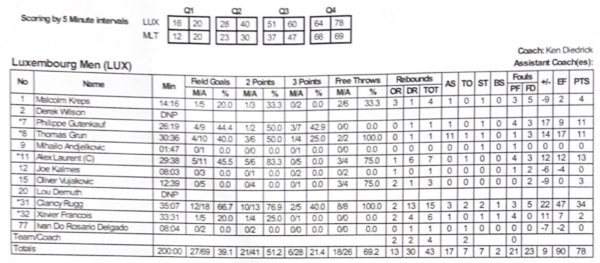 Clancy Rugg was simply unstoppable to start the game, he hit long range shots and attacked the basket and helped Luxembourg take a 40:30 lead into the break. The FLBB-squad kept the tempo high and was able to extend the lead in the third quarter with big plays. At the end of 3 quarters, Luxembourg led 60:47. Sparked by their amazing support from the stands, the home team did not give up and challenged Luxembourg. In fact, Malta stormed back and the game was close with 5 minutes remaining (64:63). The FLBB squad took over control of the game in the end and finally won this very intense game by 9 points.