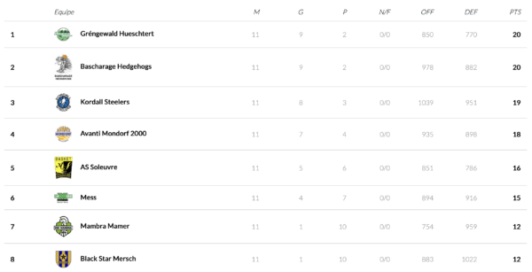 Next to Bascharage, Gréngewald stays on top of the league as well after a 75:68 home win against Mamer. The greens were led Barnes (18) and Overwater (18) while Ted Schleimer scored 15 points, Breuskin (11) and Jander (10) scored in double digits as well.