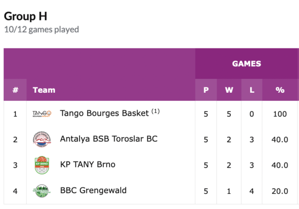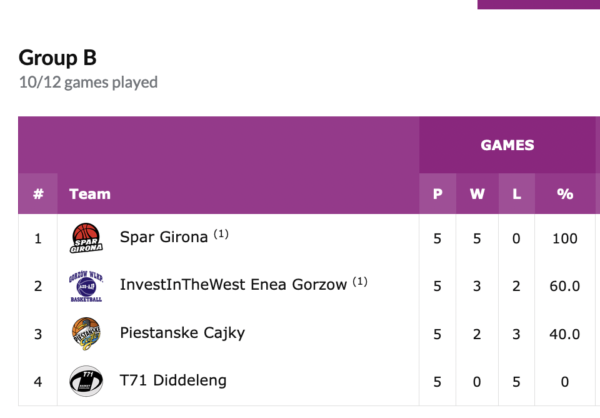 After their first victory of the competition last week against Antalya, Gréngewald will have one more home game against Bourges (France), the unbeaten leader of the group, this game will start az 19:15. T71 Dudelange will travel to Poland (Gorzow) for their last game, this game will start at 19:00.