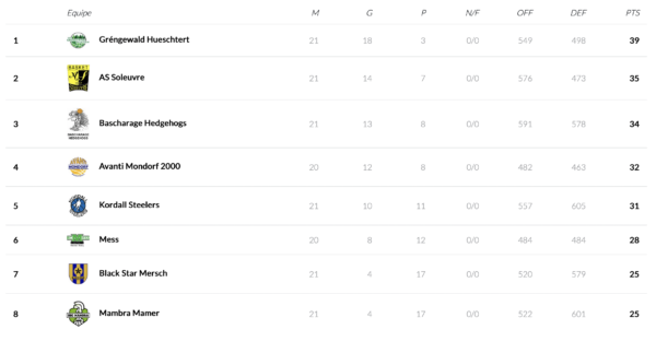 The 3rd out of 4 rounds in the men’s National 2 has been played, only one rescheduled game (Mondorf – Mess on Thursday) is on the schedule next week. After most teams have played 21 games out of 28 total, Gréngewald Hueschtert sits on top of the standings with a big 5-point-lead to a non-promotion spot, the « greens » could potentially clinch their ticket to the LBBL over the next 2 game-days.