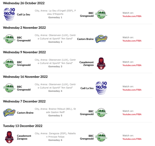 The full schedule of Gréngewald Hueschtert in the EuroCup group phase: