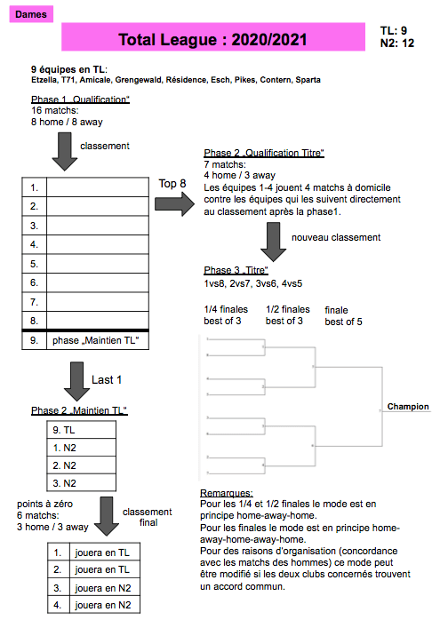 Den Ënnerscheed tëschent der Total League an der Nationale 2 ass grouss, dofir spillen och Clibb fräiwëlleg net an der héchster Divisioun. An der Total League wäerten nächst Saison 9 Ekippen aktiv sinn: Etzella, Esch, Gréngewald, Contern, Sparta, Musel Pikes, T71, Amicale an Résidence.