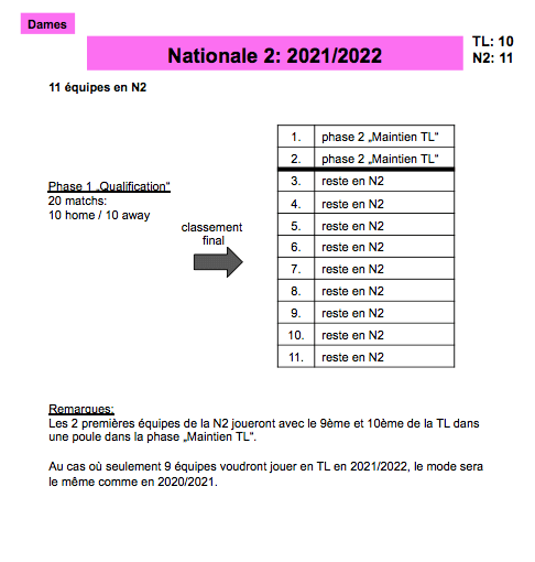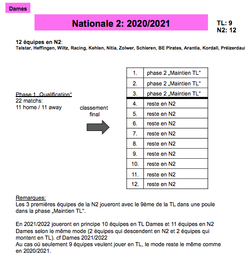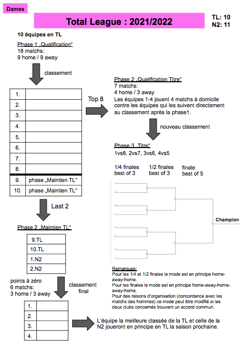 Den Tabelleleschten aus der Total League spillt an enger Grupp mat den Top 3 Ekippen aus der Nationale 2, d’Punkten ginn op 0 gesat, et ginn 6 Matcher gespillt an déi 2 bescht Ekippen spillen d’Saison drop Total League!