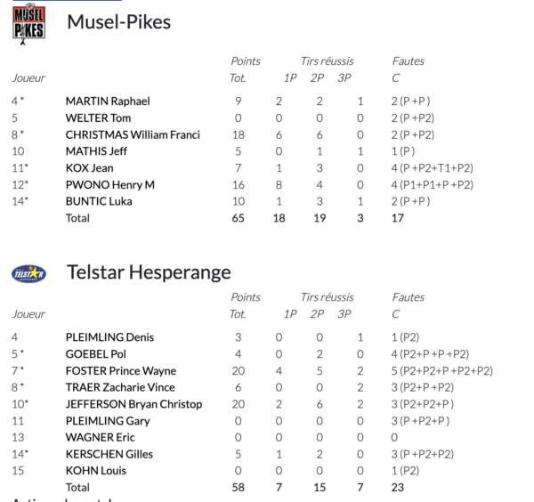 In a hard fought game on Tuesday-evening, the Musel Pikes managed to beat Telstar 65:58 and with this win took a big 3 point lead over the opponent with only 3 game days remaining in the relegation group. Telstar is now 2 points behind Contern and 3 behind the Musel Pikes and is in a desperate situation over the next 3 games. The Musel Pikes are in a good position to finish the relegation group first, they have everything in their own hands.