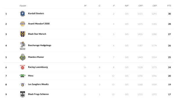 16 game days have been played in the men’s National 2 and the regular season is over. With an impressive 14:2 record, the Kordall Steelers enter the play-offs as the favorite to promote to the LBBL. Avanti Mondorf finished the regular season on the second place with a 12:4 record while Black Star Mersch comes in third with a 11:5 record. 2 out of the 6 play-off teams will immediately promote after the play-offs after 10 games while the third placed team will play a best-of 3 promotion series against the third last placed team of the LBBL. The Hedhegos Bascharage played well lately and jumped to the 4th place with a 10:6 record while Mambra Mamer (9:7) has fallen in the rankings over the last weeks. Racing Luxembourg has a balanced record (8:8) heading into the play-offs.