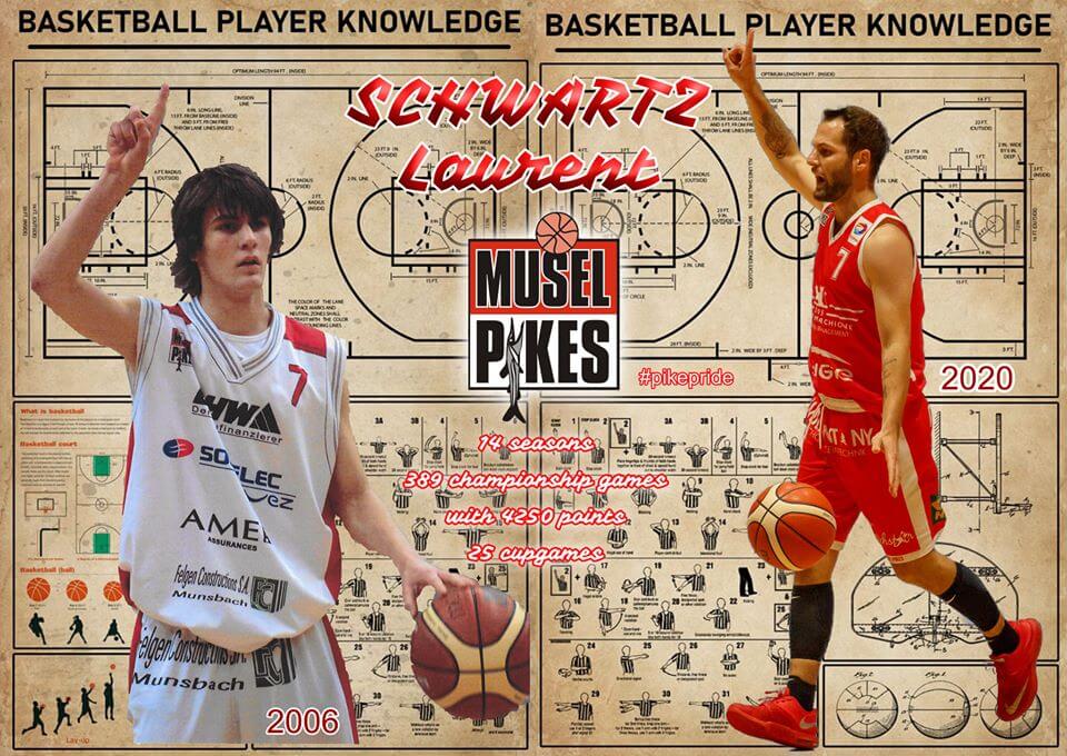 Wéi de Veräin Musel Pikes um Fréiden matdeelt, hänkt de Laurent Schwartz d’Basketschong un de Nol. Hien huet 14 Joer fir d’1. Ekipp vun de Pikes gespillt an war och fir d’Nationalekipp am Asaz.