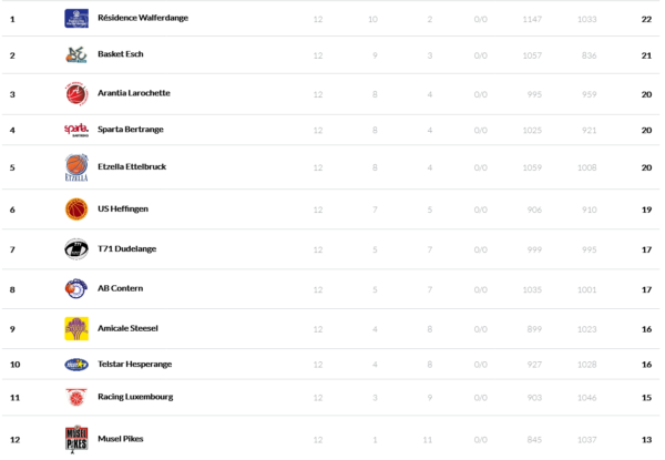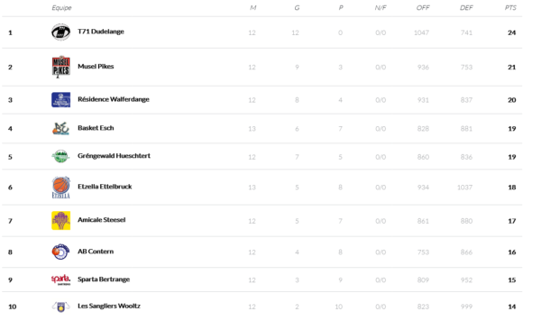 In the women’s league, Etzella was able to win 70:59 during the week against Etzella. This weekend, all 10 teams are in action as unbeaten leader T71 is challenged on the road against Contern. A highly interesting derby will be played in Walferdange as Résidence wants to confirm a strong season against Amicale, the team from Steinsel currently has a record of 5 wins and 7 losses.