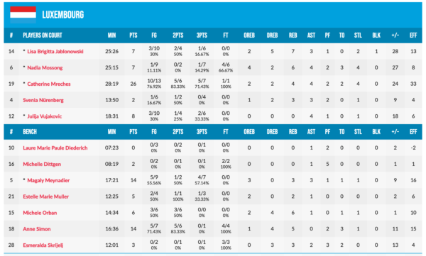 All 12 players played for Luxembourg, Catherine Mreches led the FLBB-squad with 26 points, Meynadier and Simon added 14 apiece. The team had 27 assists!
