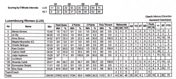 After a very intense first half, Luxembourg was able to take a 40:37 lead into the break. MAlta came out strong in the third quarter and created a small lead. The fLBB squad reacted with a big run to start the 4th quarter. Led by Julija Vujakovic and Kyra Coulon, Luxembourg scored 13 points within 2 minutes to take the lead. Sparked by its home crowd, Malta managed to stay in the game but Luxembourg was able to win the game by six points.