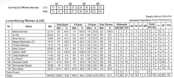 After a balanced first half, the team of head coach Mariusz Dziurdzia trailed 24:27 behind a strong performance by Anne Simon, she scored from all positions and kept Luxembourg in reach. In the third quarter, Montenegro went on a run and started to build a 14-point lead. The FLBB-squad managed to keep the deficit in the 10-point range until the final buzzer.