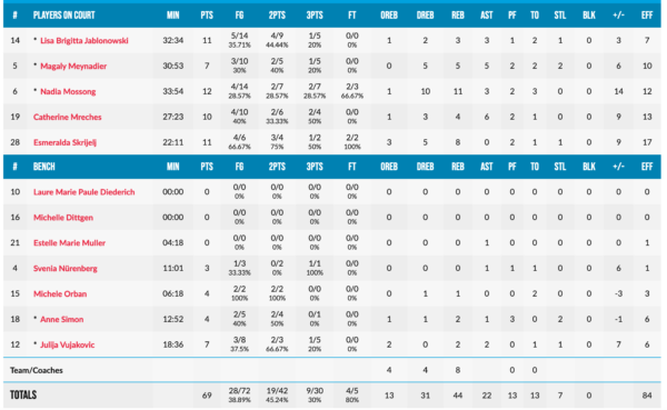 In a balanced first half, Luxembourg had a 32:22 lead early in the second quarter but Ireland fought back and the score was tied at the break (41:41). 9 players scored for the FLBB-squad in the first 20 minutes but Ireland showed a great team effort as well with 8 different scorers in the first 2 quarters. Both teams played a on a very similar level in the first half in a very entertaining game.