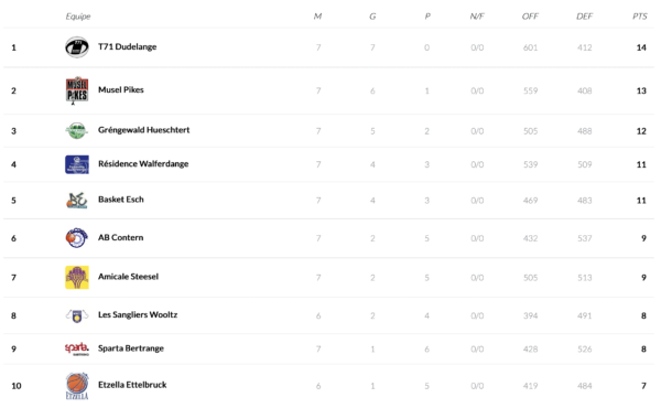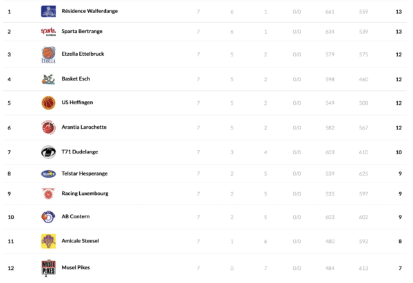 It was one of the main questions before the season … which team(s) will be the favorite(s) to win the title in the men’s LBBL? While it was difficult to make predicitions with the number of player and coaching changes, we now have a first impression and the question is still difficult to answer. Résidence is having another strong season, Sparta is on a 6-game winning streak as these two teams are currently sitting on top of the standings. Four teams are following with the same record (5:2): Esch, Etzella, Arantia, Heffingen. There is clearly a cut in the standings between place 6 and 7 but there is still a long way to go. It could become a very interesting race with multiple teams having a chance to compete for the title(s).