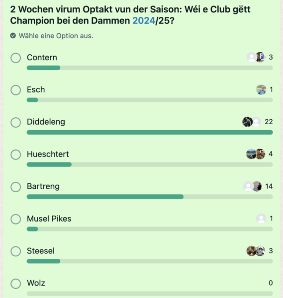In our WHATSAPP COMMUNITY / click here to join , people were invited to vote for the favorite in the women’s championship. At this moment, T71 Dudelange received the most votes to win the 2024/25 championship title.