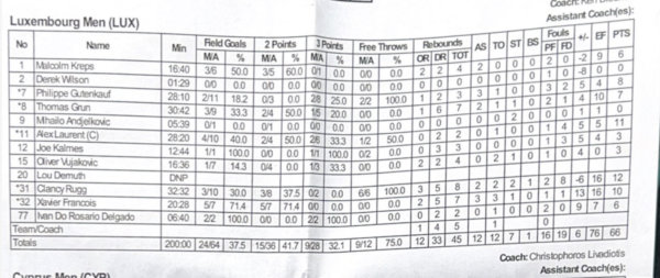 Luxembourg had a fast start and led 8:0 after a highlight dunk by Alex Laurent (video). The FLBB squad kept playing at a high pace and took a 22:8 lead after Kreps’ buzzer beater to end the first quarter (video). However, Cyprus managed to storm back before the break and Luxembourg « only » had a 4-point lead at half-time (34:30). In a very intense second half, Luxembourg managed to come up with a 6-point victory.