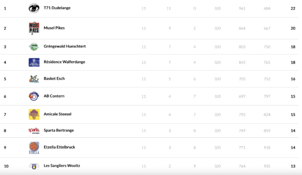 For the bottom teams in the standings, 11 game-days remain to avoid the relegation-group and enter the play-offs. The top 8 teams will qualifyfor the play-offs at the end of the season. At this moment, Telstar, Amicale, Racing and the Musel Pikes would miss out on the play-offs. In the relegation group, 6 moe games will be played, 2 teams will move down to the National 2 while the third last placed team will play a relegation series (best-of-5) against the third placed team of the second league.