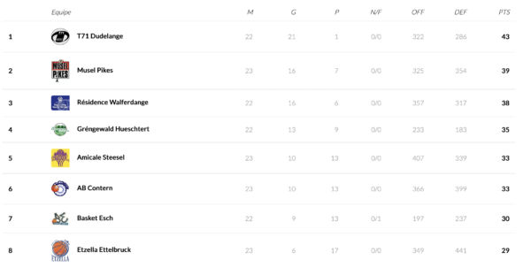 This weekend, a full game day is scheduled as league leader T71 has to regroup after a bitter loss in the cup final on Saturday and focus on the championship. The team of coach Jérôme Altmann is on the road in Contern, Dudelange is already sure to start the play-offs as the number one seeded team. Cup winner Résidence will host Basket Esch and the team from Walferdange wants to finish the season second and they have the chance to do so over the next weeks.
