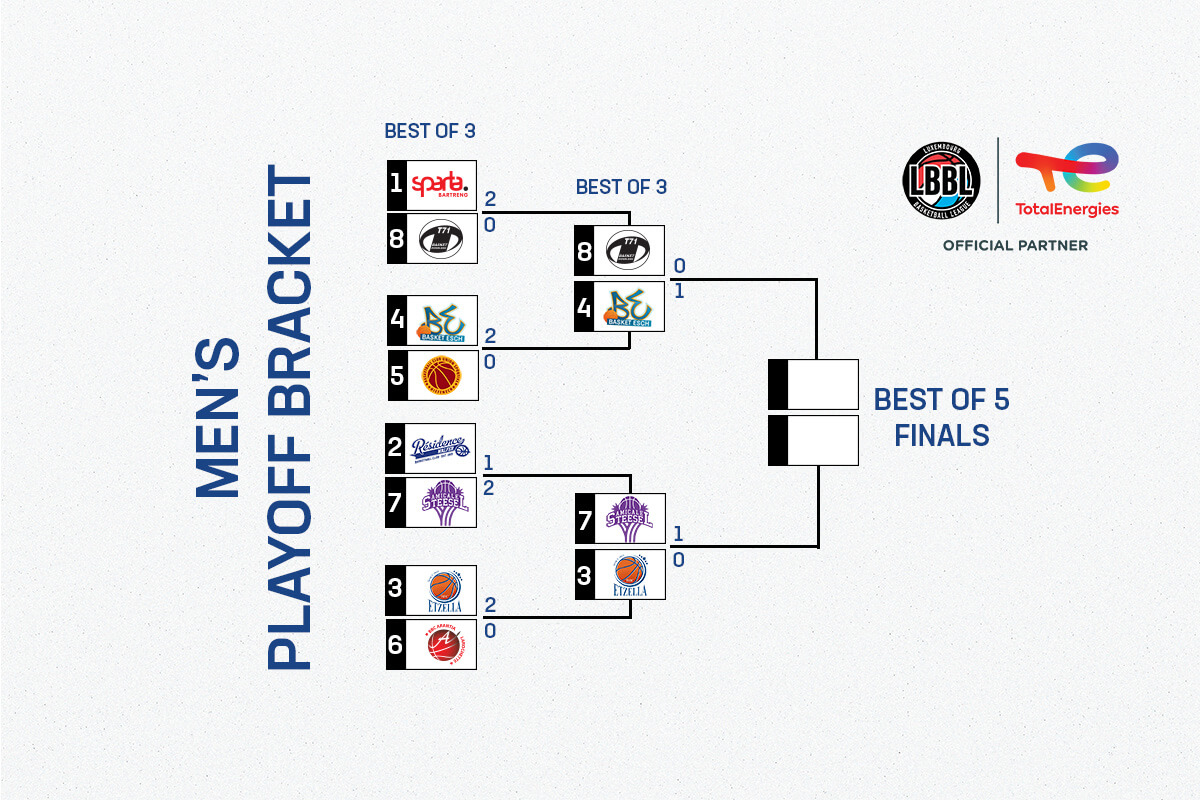 On Saturday, game 2 of the men’s semi finals will be played. T71 needs a win against Basket Esch to keep its season alive while Etzella is facing elimination on the road in Steinsel. T71 needs to find a way to slow down national team player Clancy Rugg who dominated game 1 under the baskets with 23 points and 14 rebounds. After their first round surprise against Sparta, the team of coach Tom Schumacher can play without any pressure, but certainly the team is confident enough to have the goal of forcing a decisive game 3.