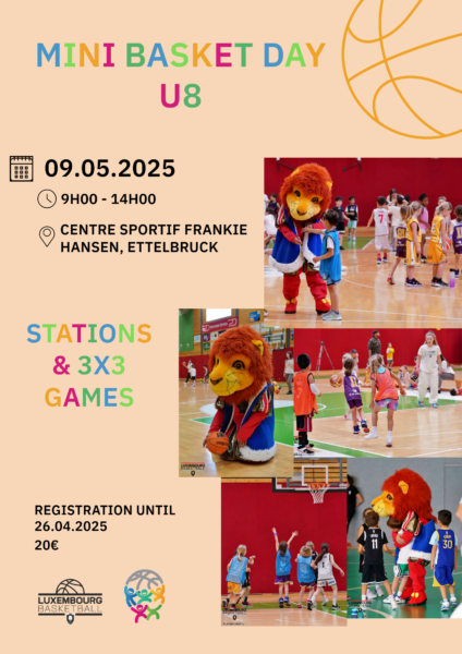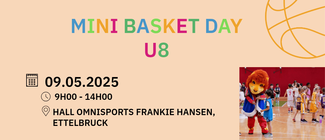 As part of the Mini Basketball Project, we are excited to announce the program for the « Mini Basket Day U8 », which will take place at the « Hall Omnisports Frankie Hansen » in Ettelbruck on Friday, May 9, 2025: