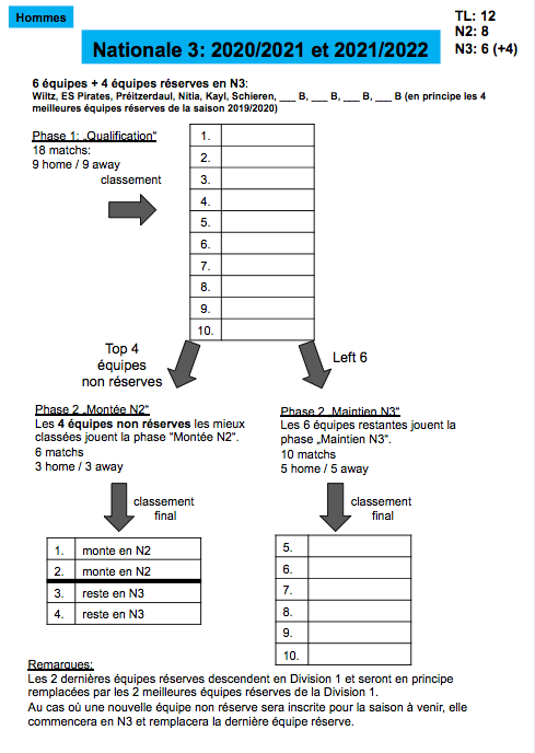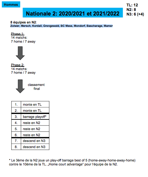 –> In der Nationale 2 spielen in der kommenden Saison 8 Mannschaften (Zolwer, Mersch, Kordall, Grengewald, BC Mess, Mondorf, Bascharage, Mamer), die Teams spielen jeweils 4 Mal gegeneinander. Es gibt 2 garantierte Aufsteiger, der drittplatzierte Club spielt eine Relegationsserie gegen den drittletzten Club aus der Total League.