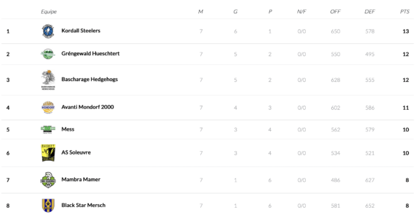 After 1 round (all teams have played against each other once), the Kordall Steelers are on top of the standings with a record of 7 wins and 1 loss. Gréngewald and Bascharage follow the leader while Mondorf also has a winning record after 7 games. In total, all teams will meet 4 times this season. 2 teams will promote to the LBBL while the 3rd placed team will have a chance to promote in a best-of-5 series against the third last placed team from the LBBL. 2 teams will move down to the National 3.