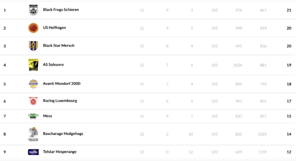 On Saturday, two main games will be played. League leader Black Frogs Schieren (7:3) will host league favorite US Heffingen (7:2). The guests have the best record in the league and could take the lead in the standings with a victory on the road. Mondorf has been on the rise over the last weeks and is looking to defend home court against Black Star Mersch. Both teams have a similar record (8:4 and 7:4) which makes this game extremely important. Mersch added Sam Ferreira (Mamer) to reinforce the team, he could become a majory piece in the fight for promotion for Black Star.