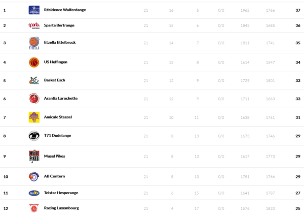 Places 3 to 6 will be decided between Etzella, Heffingen, Basket Esch and Arantia. Etzella is currently 3rd and has good cards to stay in this place as the team can only drop in the standings if it loses to Heffingen by more than 18 points! (The first game ended 92:75 for Etzella). On the other hand, Heffingen could potentially reach the 3rd place in the standings with a clear victory. A 3-team tie between Heffingen, Basket Esch and Arantia is also a possibility. In this 3-team tie, Esch is ranked first, Heffingen second and Arantia third.