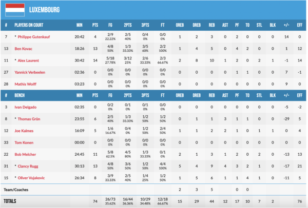 Alex Laurent and his teammates came out aggressive in the second half and Luxembourg showed a reaction to cut the opponent’s lead to 13 points twice. After 3-pointers by Kovac and Kalmes, Luxembourg only trailed by 11 points late in the third quarter and there was hope that Luxembourg could turn the game around in the final period.