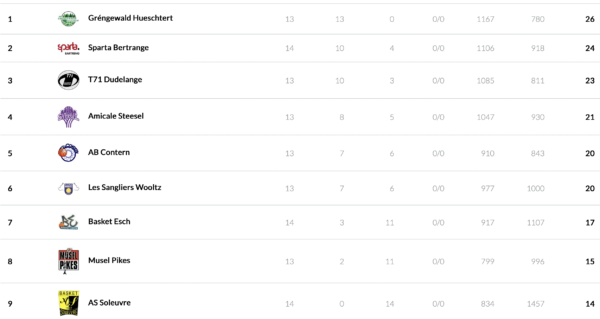 | Basket Esch | 17 | 11:6 | 28 |