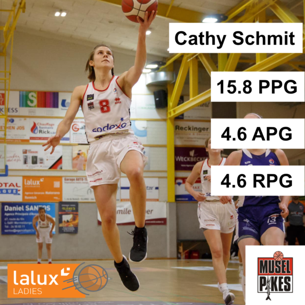 The unbeaten leader Musel Pikes (5:0) won its game against Etzella last week and will get a week of rest as always one team does not play in the women’s 9-team-league.