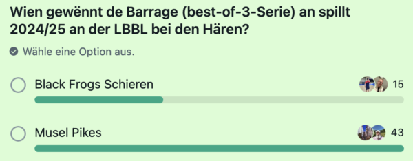 The Black Frogs Schieren (N2) and the Musel Pikes (LBBL) will compete in a best-of-3 series to determine which team will play in the LBBL in the upcoming 2023/24 season.
