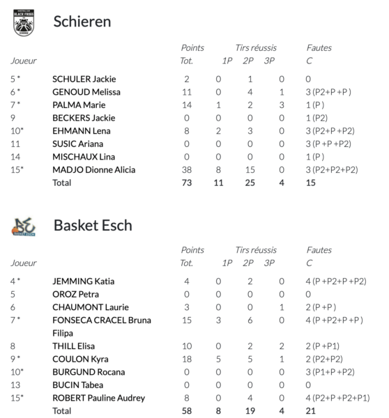 In the women’s category, the Black Frogs Schieren were able to win the championship, the team of coach Diogo Lopes won 73:58 against Basket Esch. Schieren came back from a deficit in the first half to win this final. Dionne Madjo had a spectacular performance with 38 points
