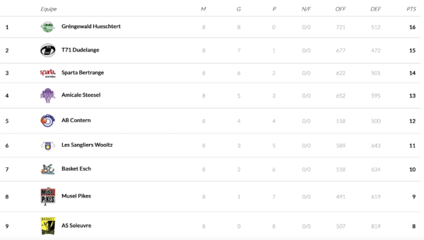 In the women’s LBBL, Wiltz and T71 meet for a second time this week after playing against each other in the cup competition on Wednesday. Contern will try to grab a home win over the winless team from Zolwer on Saturday. On Sunday, Sparta is looking to stay in reach to the top teams in the standings at home against the Musel Pikes, a team that only has 2 wins so far this season.