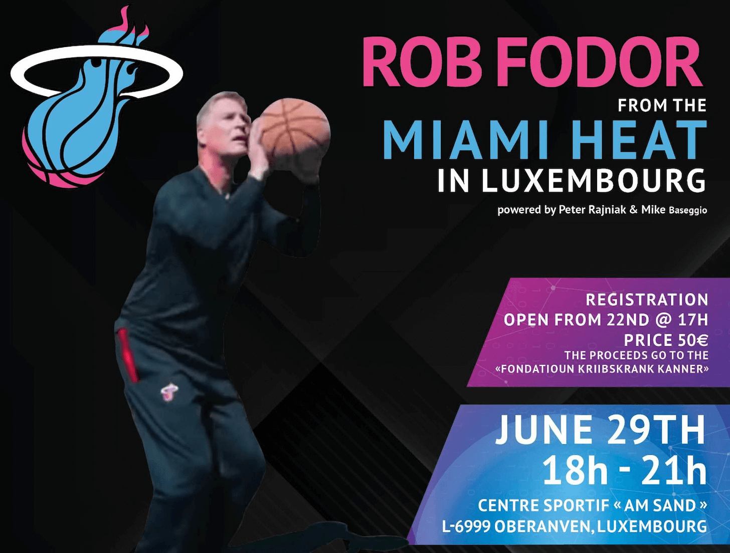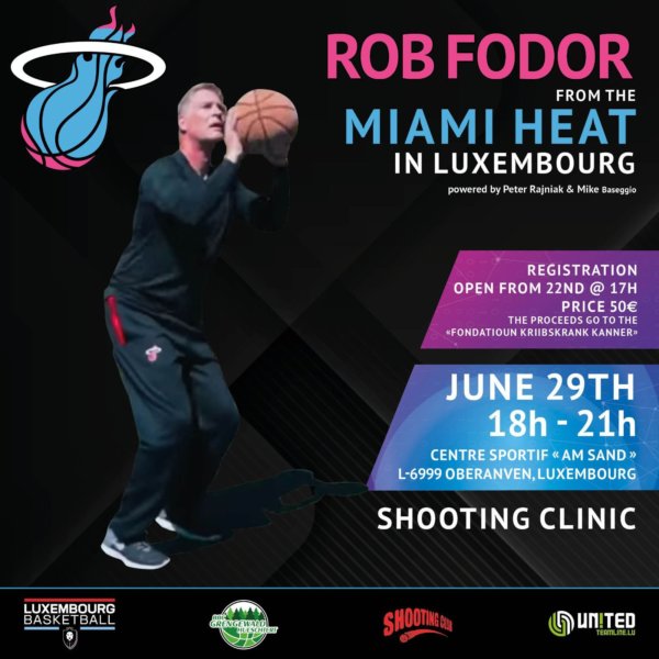 The national basketball federation, in collaboration with Gréngewald Hueschtert and shooting club Luxembourg, organizes a shooting clinic with shooting coach Rob Fodor from the Miami Heat (NBA team) on June 29thin Oberanven. The event will be presented by Peter Rajniak and Mike Baseggio.