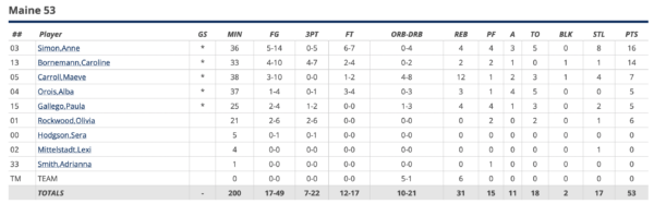 Anne Simon scored a team-high once again with 16 points in a 53:45 victory against New Hampshire, she also had 8 steals (!), 4 rebounds and 3 assists.