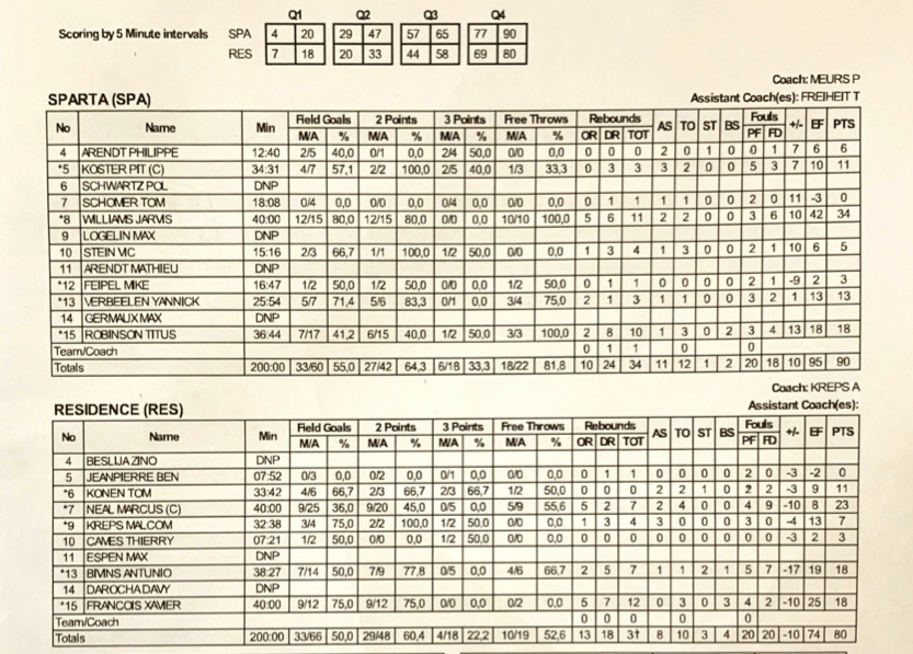Um Freiden-Owend huet sech d’Sparta Bartreng zum Optakt vun der Op- an Ofstigsgrupp mat 90:80 géint Résidence Walfer duerchgesat. Den Amerikaner Jarvis Williams huet mat 34 Punkten iwwerzeegt, de Yannick Verbeeln konnt 13 Punkten fir d’Sparta markéieren.