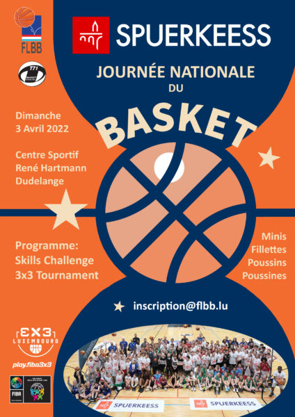 Déi traditionell Journée Nationale du Basket fënnt dëst Joer den 03. Abrëll 2022 zu Diddeleng am Centre Sportif Hartmann statt.