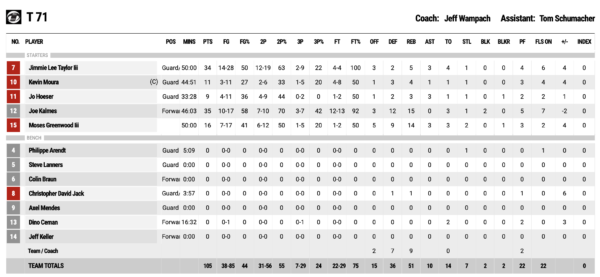 – In overtime, the spectators saw the same situation as T71 had the ball on the last possession. After having troubles to inbound the ball multiple times in a row, Jo Hoeser threw if off the back of a defender and found Kevin Moura who could not hit the shot (video)