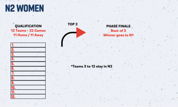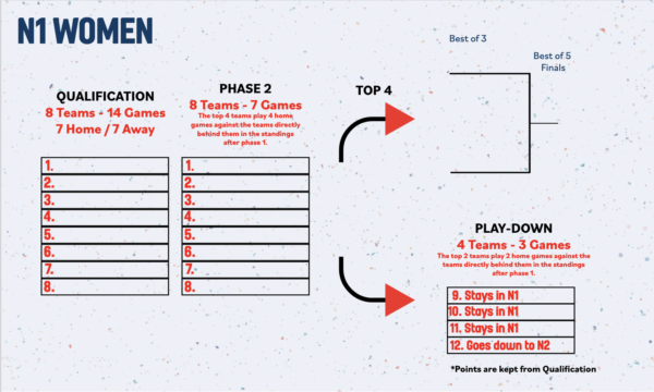 In the women’s competition, the game mode has changed because the number of teams has been reduced to 8 teams moving forward. All 8 teams will meet each other 3 times before the start of the semi finals and the play-down. 1 club will relegate to the National 2. The top 2 teams of the National 2 season will play a promotion best-of-3 series to fight for a spot in the highest league.