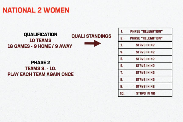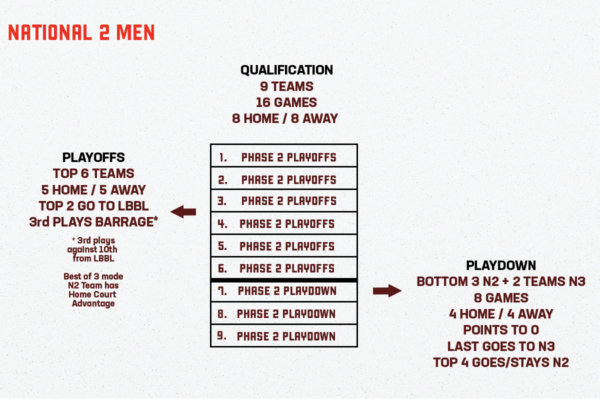 In the men’s National 2, 9 teams will compete. The top 6 teams will enter the play-offs where all teams meet each other twice. The best two teams promote to the LBBL while the third best team will play a promotion-series against the third worst team from the LBBL.