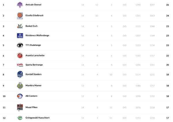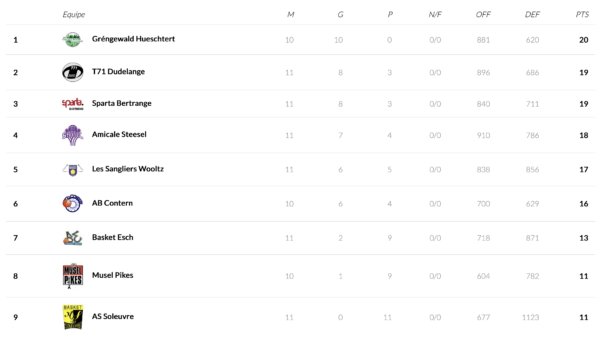 The race for the 8 play-off spots continues. With 8 remaining game days, a lot remains possible but some teams face some pressure. The Musel Pikes and Gréngewald (both 3:11) need a winning streak to get back in the playoff mix. While the current top 6 teams – those with a winning record – seem to be on the right track to qualify sooner or later, the places 7 to 10 are currently close together. Sparta and Contern are seperated by only 2 points while Contern and Mamer have a rescheduled game to play on January 17th.