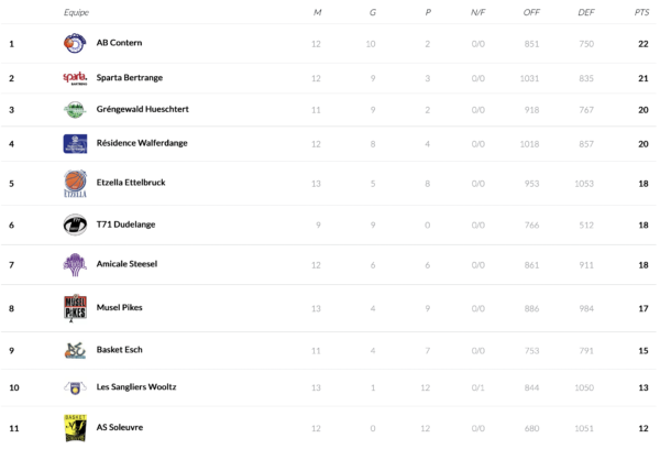 The standings in the women’s league are not the best indicator to determine the strength of the teams at this point. Teams have played between 9 and 13 games so far and the only unbeaten team, T71 Dudelange, is only 6th in the standings at the winter break. On Saturday, the current champion is in action at home against Gréngewald Hueschtert, both teams participated in the EuroCup competition and can now focus on the national championship and cup competition, both face a loaded schedule over the next weeks. AB Contern has been the positive surprise of the season and the team of coach Fabienne Fuger is currently the league leader with a 10:2 record. However, Contern faces a difficult challenge on the road against Résidence Walfer, a team that is looking to stay under the best 4 teams. At least one out of the 11 LBBL teams team is going to relegate to the second league at the end of the season, the bottom 3 teams will play in the relegation round against the best two teams from the National 2. The winless team from Zolwer and Wiltz (1 win, 12 losses) looks like the two teams that could be in danger. Zolwer has improved after the signing of Jade Compton and recently added Lele Grissett, another professional player. With these additions, the team should become competitive and it might be a good chance to turn the season around.