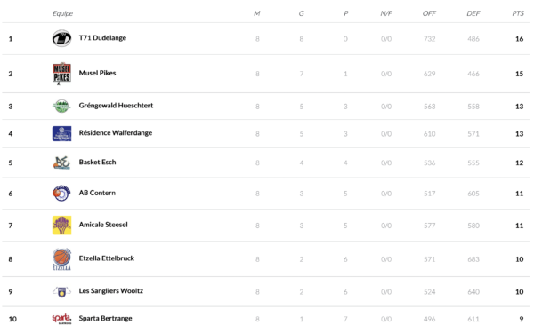 T71 Dudelange is the unbeaten leader in the championship and the team is clearly the favorite to repeat this season after their strong performances so far. This weekend, the team of coach Jérôme Altmann has 2 tests on the road coming up, the first one in Esch and the second one in Stadtbredimus against the Musel Pikes, the top game of the week!