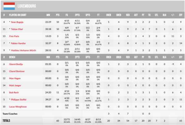 Luxembourg led 16:5 after the first quarter and managed to keep the lead until the final buzzer in a close game. Philippe Stoffel led Luxembourg with 14 points.