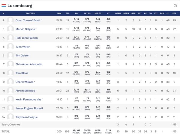 Luxembourg led 53:19 at the break and won the game 109:39. All 12 players scored points for the FLBB squad. Abram Macalou led team with 22 points. Marvin Delgado had a triple double with 11 points, 11 assists and 10 rebounds.