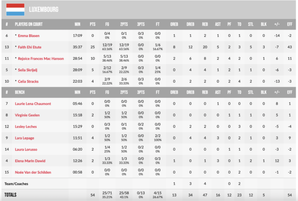 Faith Ehi Etute scored 25 points and Rejoice Mac Hanson added 10 points and the FLBB-squad won the final quarter but it was not enough as Luxembourg did not hit a shot from outside (0/13) and missed some free-throws (4/15).