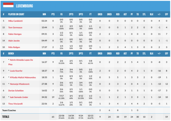 With this loss, Luxembourg misses the final and therefore a chance to promote to the Division B. Isak Semedo Linder led the team with 19 points in this game, he was the only player in double digits for the FLBB squad.