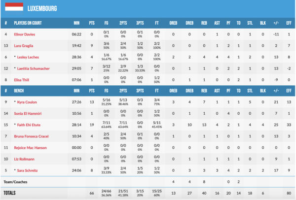 Luxembourg decided this game early and led 18:7 after the first quarter and 43:14 at the break. Faith Ehi Etute led Luxembourg with a double-double (19 points, 13 rebounds, 4 blocks), Kyra Coulon scored in double digits as well (13 points, 7 rebounds, 5 steals).