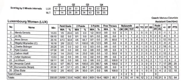 Amanda Cahill led Luxembourg with 20 points, Anne Simon added 11 points and Esmeralda Skrijelj and Ehi Etute each scored 10 points for the FLBB-squad.